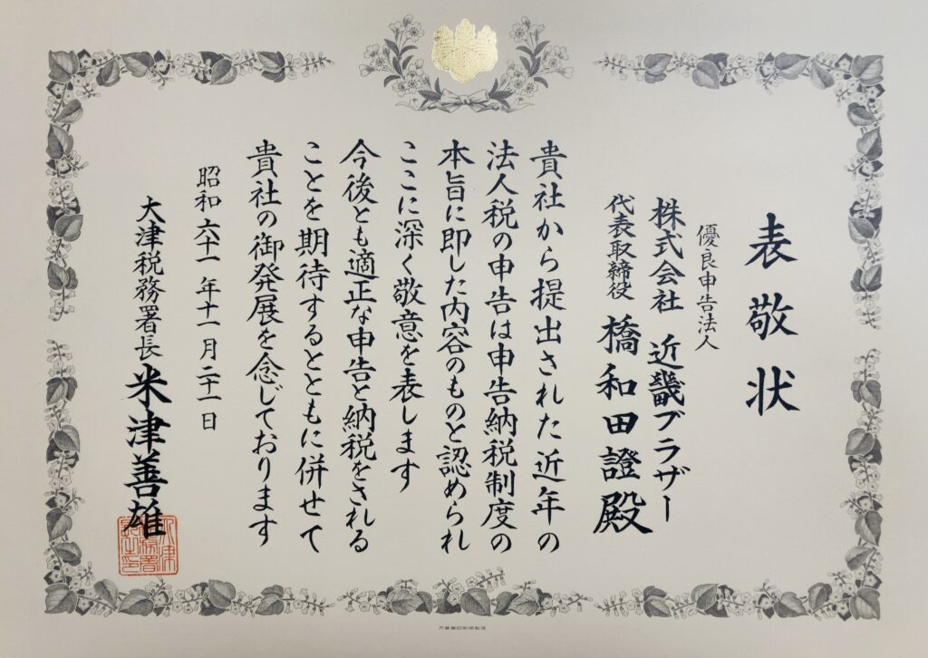 大津市税務署より優良申告法人として第3回表敬を受ける。